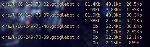 首先我使用iftop流量监测工具查看情况,直接弹出4行带有googlebot的连接