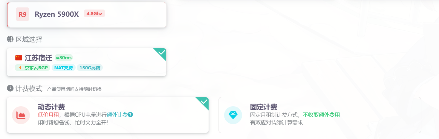 正式尝试的第一家还是雨云,这家厂商提供的游戏云vps规格较多,低配有E5 2666v3高配有i9 13900KF。但是这家的计费方式很独特,分为固定计费和动态计费,如图所示。